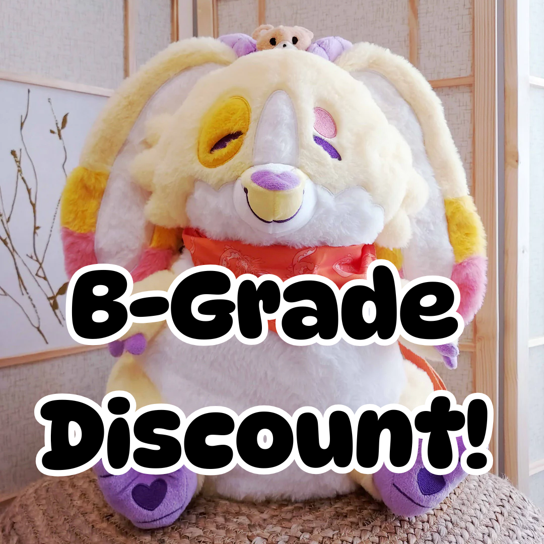 B-Grade plush are usually easily fixed with sewing, replacing bandana or straps, or can be made into great travel companions or cuddle buddies you don't have to worry about getting dirty or messed up.